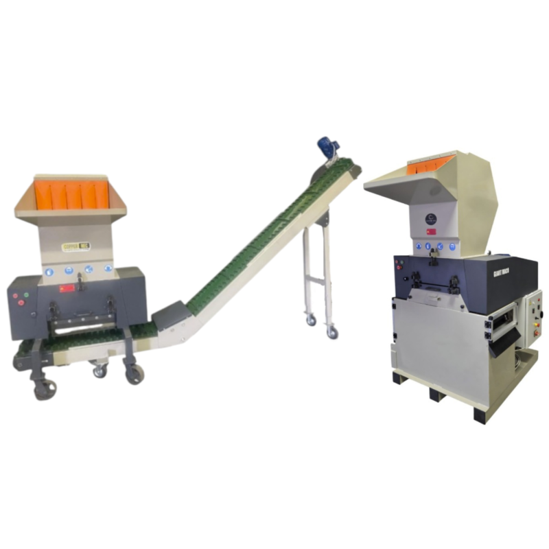 It has a capacity of 400-500 kg/hour input and includes a MAC100 pre-shredder, 22 kW power with 21 rotating blades and 4 fixed blades, a 3.5 m motorised conveyor and a GIANT MACO separator granulator, 14 kW power with 15 rotating blades and 2 fixed blades.